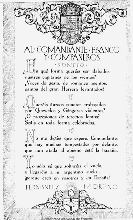 Dos años después de tomar esta decisión, el 22 de enero del 1926, se inicia en el Puerto de Palos el raid del hidroavión Plus Ultra que, con la llegada a Buenos Aires el 10 de febrero, unirá, por primera vez, España con Argentina; esa España y esa Argentina tan caras a Fernández Moreno. Podríamos decir que, envuelto en el fervor que acompaña el acontecimiento, “no puede evitarlo” y escribe, en franco tono épico, el soneto titulado “Al Comandante Franco y Compañeros” que la revista Caras y Caretas publica a página entera el día 23 de enero y que ilustra esta nota.