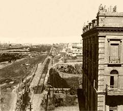 La Av. Paseo Colón a fines del siglo XIX. Las vías corresponden al ferrocarril que hacía el recorrido desde la estación ubicada en las actuales Leandro Alem y Rivadavia hasta el puerto de la Ensenada. Puede observarse que el relleno alcanza el nivel de las vías y a su derecha puede verse el talud que muestra cuál era el nivel del terreno antes de iniciar el relleno. Existen imágenes anteriores a esta, en las que puede observarse que las vías se encuentran elevadas y apoyadas en un viaducto de columnas de hierro.