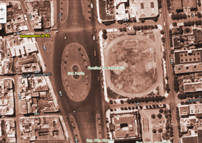 Fotografía área de 1940 en la que puede distinguirse la pista de atletismo y algunas construcciones sobre la calle Independencia.