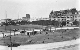 El predio con la pista de atletismo visto desde la vereda este de la Av. Paseo Colón. La foto es anterior a 1937, cuando se traslada a la plazoleta el “Canto al Trabajo” de R. Yrurtia. Sobre el lado derecho se ve el edificio de la Secretaría de Agricultura, Ganadería y Pesca, que terminó de construirse en 1937 y fue inicialmente sede de YPF